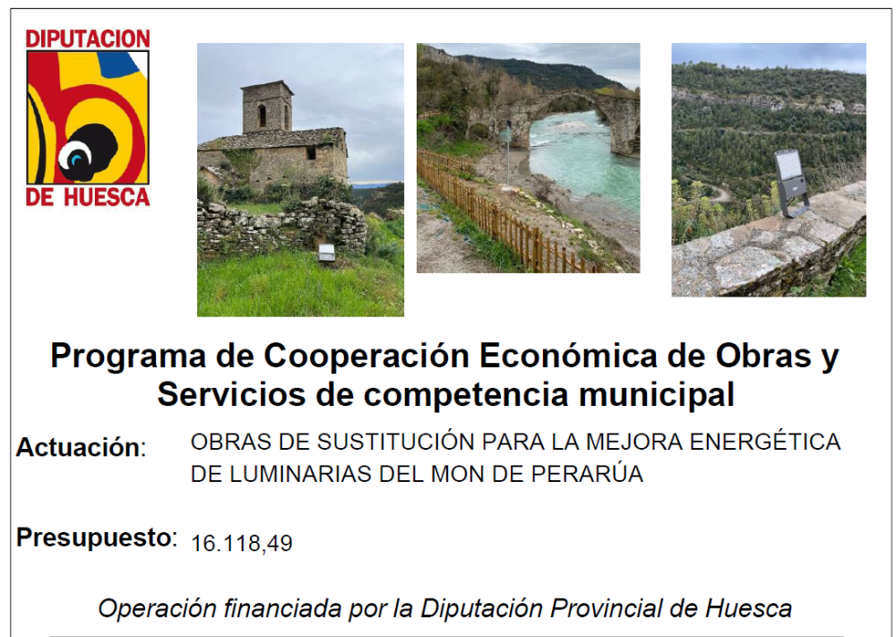 En Perarrua, se localiza la primera actuación de sustitución de luminarias en la zona del Mon, que resuelve la problemática energética, ya que anteriormente constaba de 7 focos de 400w y 3 de 1000w con un alto consumo energético.